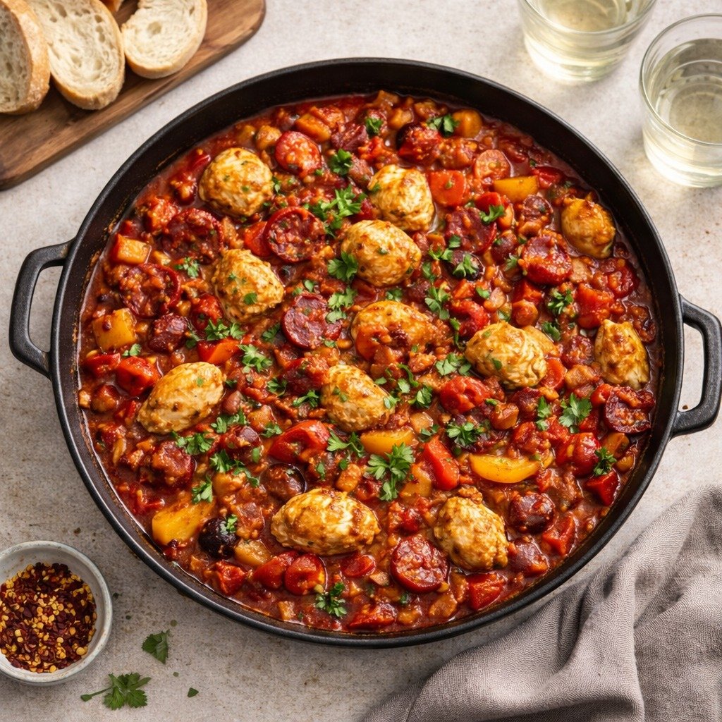 A rich one-pot classic — tender chicken, smoky chorizo and roasted peppers, slow-simmered to perfection.