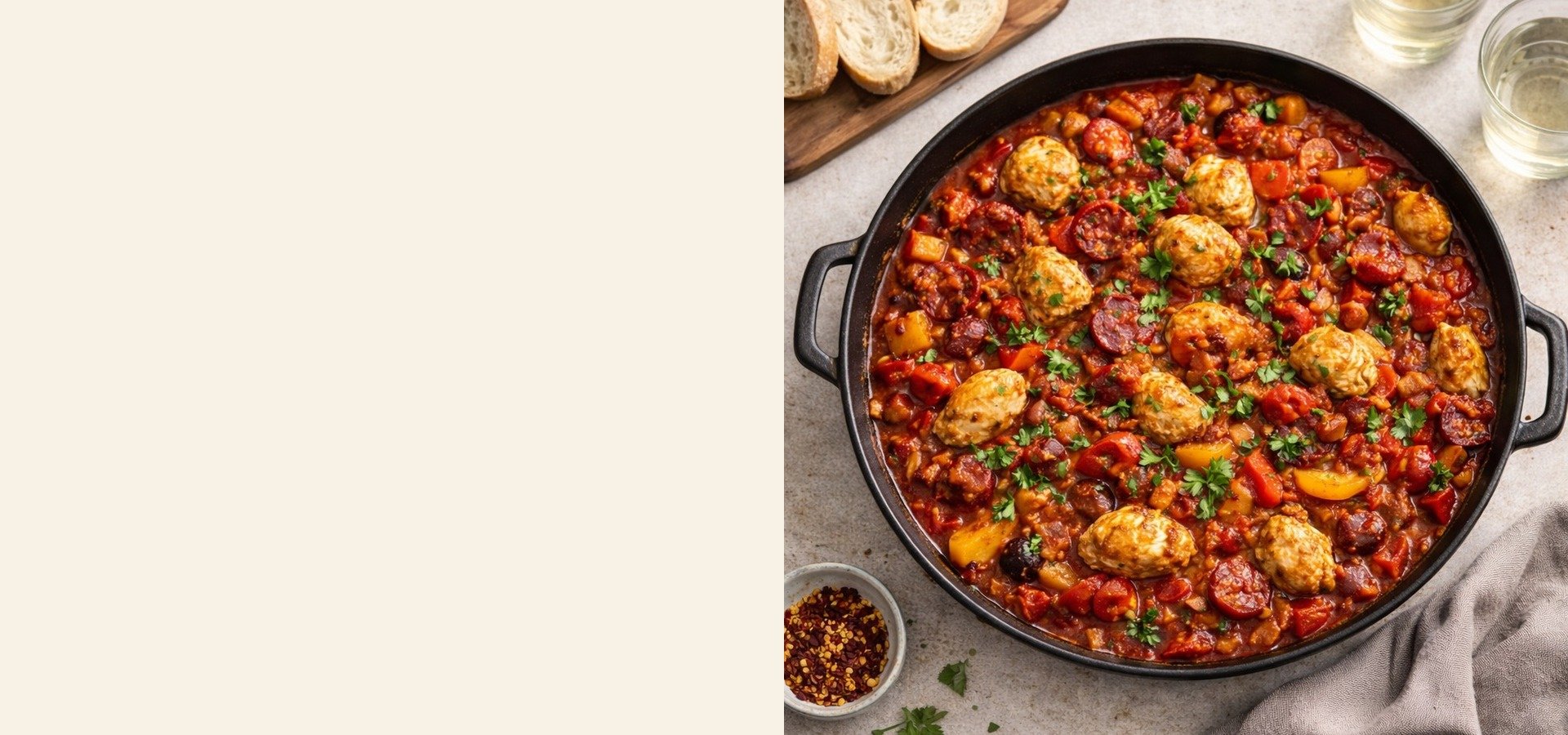 A rich one-pot classic — tender chicken, smoky chorizo and roasted peppers, slow-simmered to perfection.